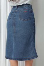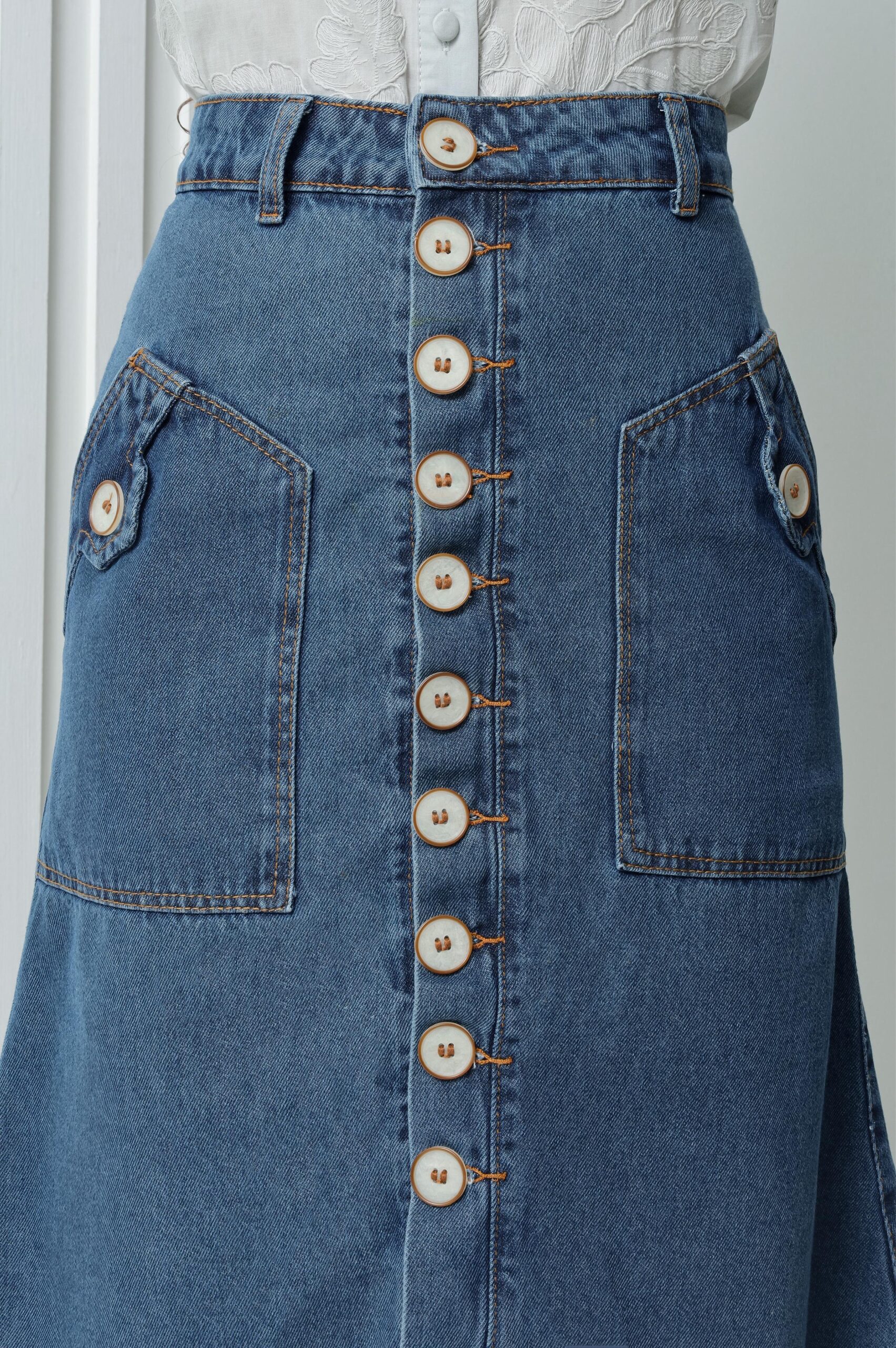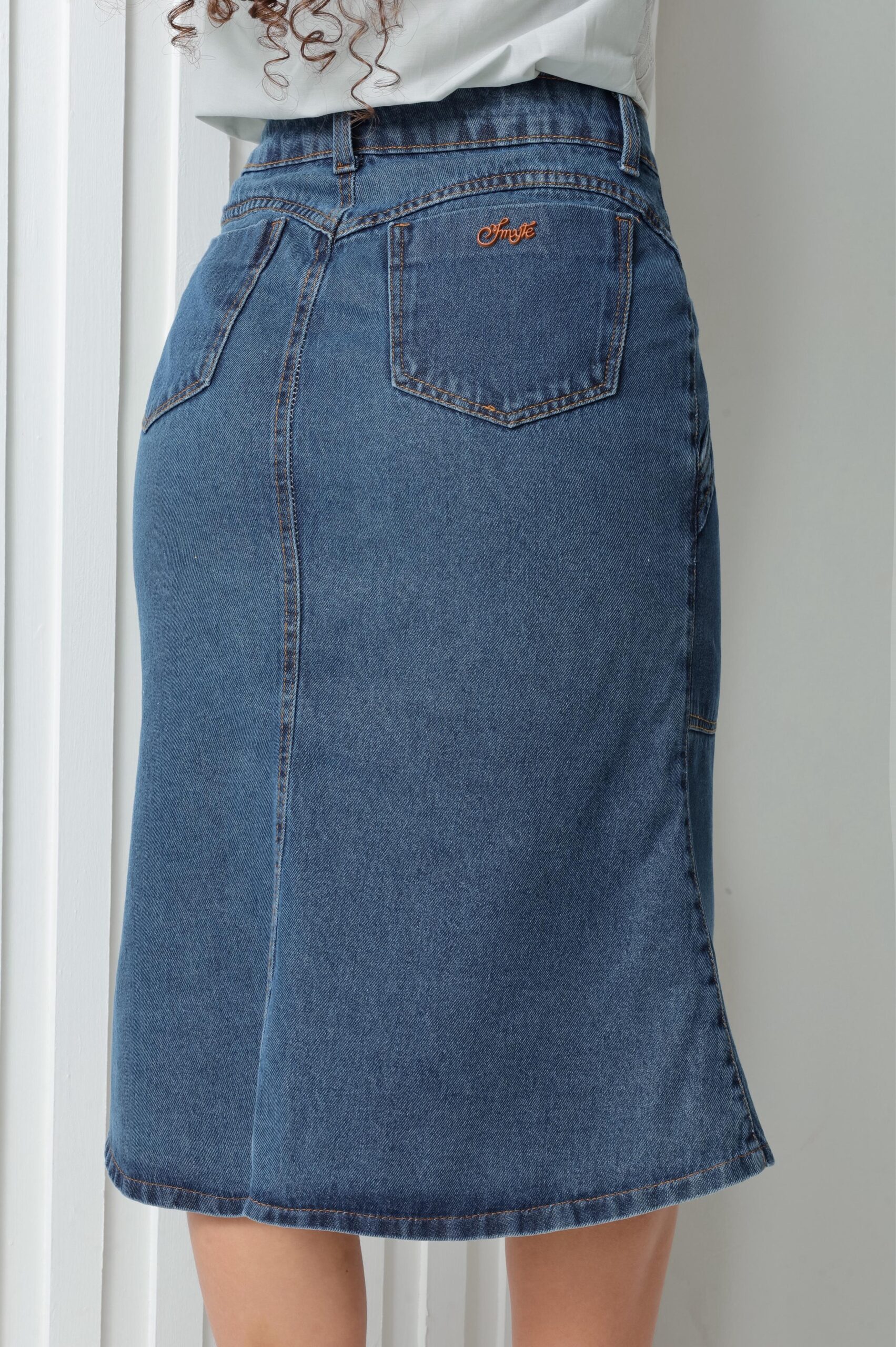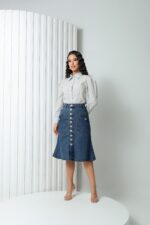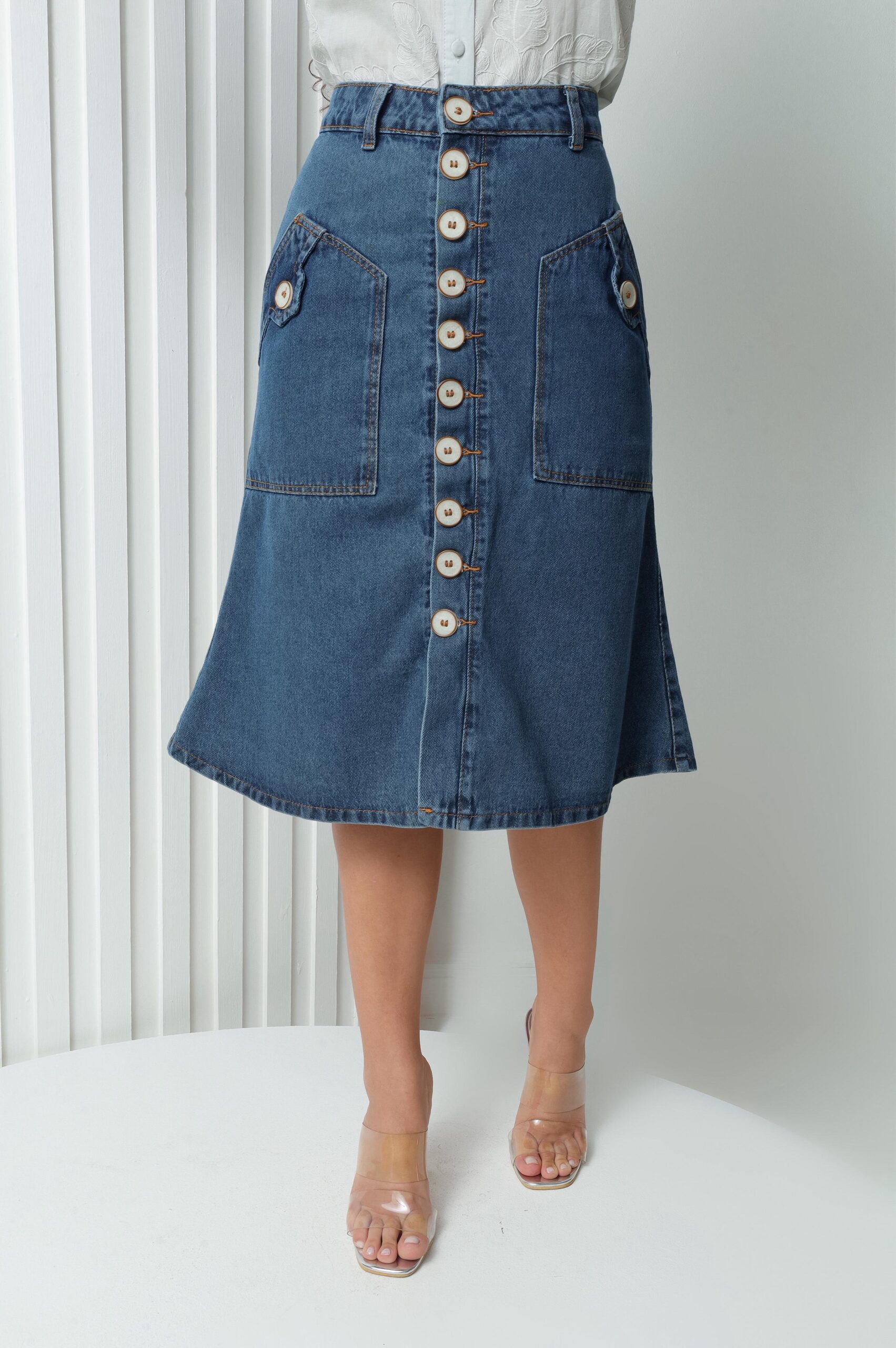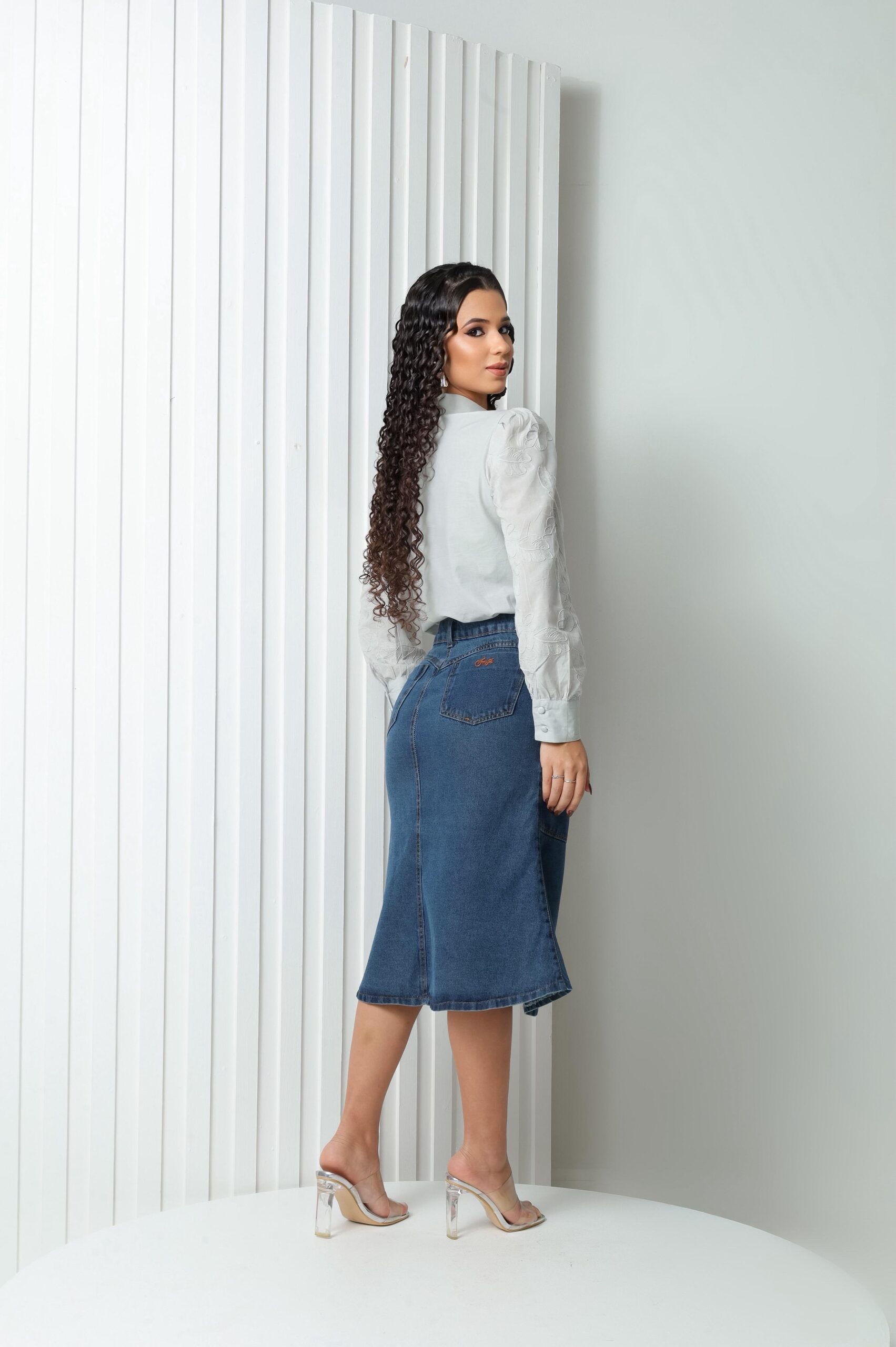 A Saia Midi Botões Frontais é confeccionada em jeans 100% algodão, garantindo resistência e caimento estruturado. Conta com botões frontais perolados que trazem um toque delicado e sofisticado, além de bolsos funcionais que oferecem praticidade no dia a dia. Uma peça versátil para compor looks casuais ou elegantes.