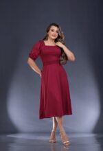 Possui mangas bufantes com bordados florais delicados, que adicionam um toque romântico à peça, e decote quadrado, que realça o colo de forma elegante. Seu comprimento midi traz sofisticação e versatilidade, permitindo composições tanto para o dia quanto para a noite.