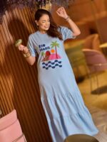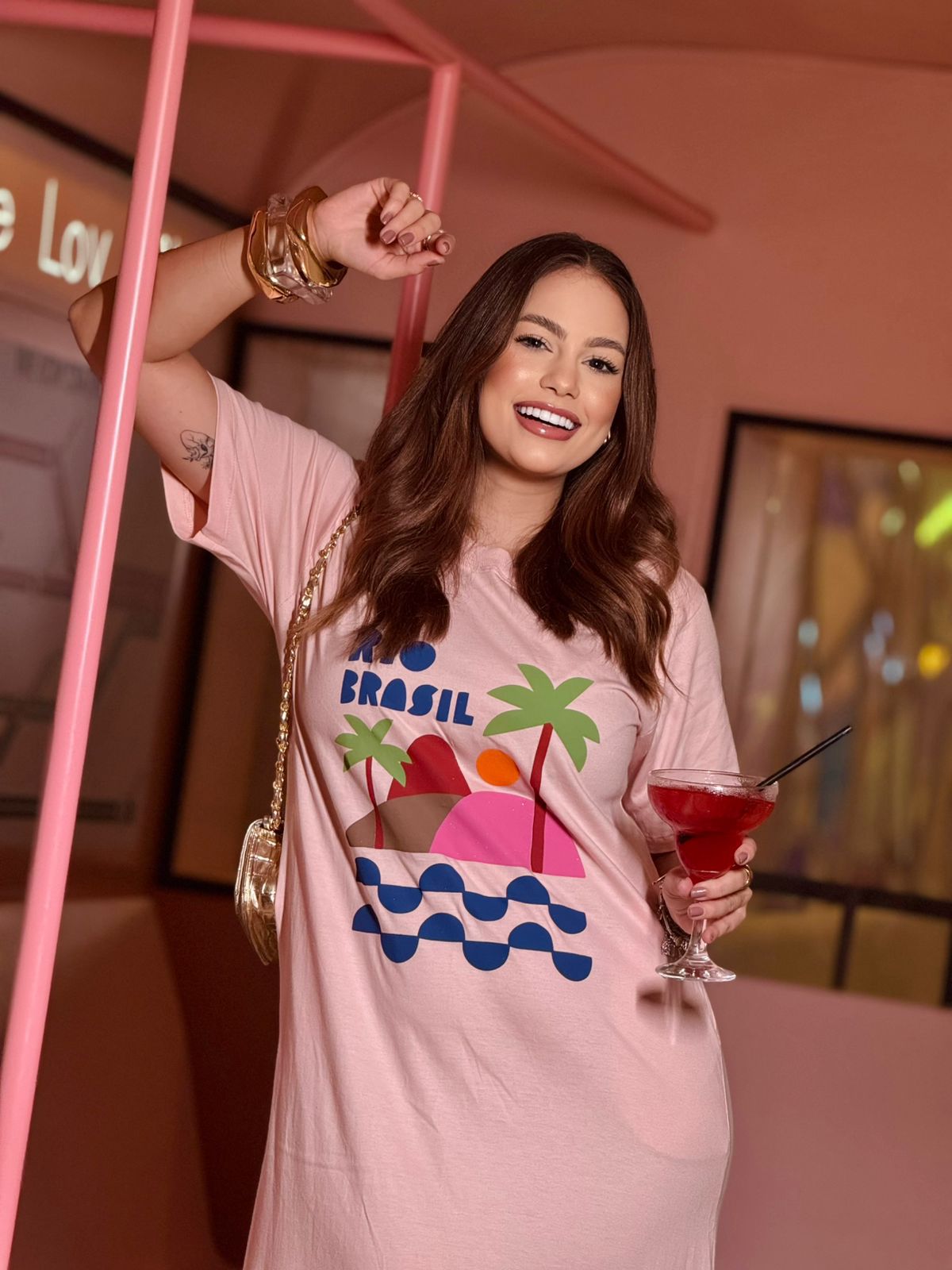 Possui modelagem longa ,marias na barra, que proporcionam movimento e leveza.
